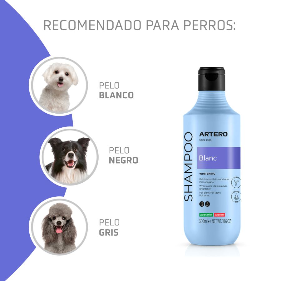 El Champú Artero Blanc está destinado, principalmente, a perros de pelaje blanco, gris y/o negro. Sus pelos tienden a perder brillo y tornarse opacos por agentes externos propios de su vida animal.
