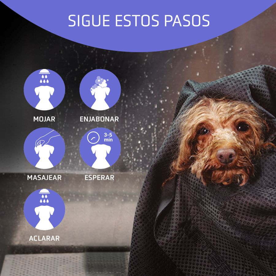 <p>→ Aclarar con abundante agua</p></div><div data-content-type="divider" data-appearance="default" data-element="main"><hr data-element="line" data-pb-style="H9TC5DG"></div><div data-content-type="text" data-appearance="default" data-element="main" data-pb-style="VJRGMJG"><h2 id="F2HFEWC" style="text-align: center;"><strong>¿Deseas un mejor resultado? </strong></h2></div><div data-content-type="text" data-appearance="default" data-element="main"><p style="text-align: justify;">Enjabonar dos veces con este <strong>champú para perros blancos</strong>, con sus correspondientes aclarados y recordar dejar actuar la segunda aplicación entre 3-5 minutos antes de aclarar, cuanto más tiempo permanezca el champú en el animal mayor será el efecto.</p>