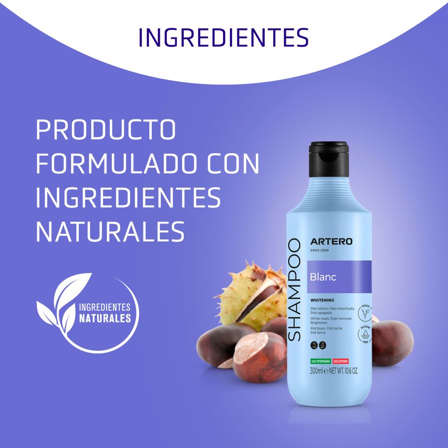 <p><a tabindex="0" href="https://artero.com/es/petcare/champu-blanc-5-litros">También disponible en 5L.</a></p></div></div><div class="pagebuilder-column" data-content-type="column" data-appearance="full-height" data-background-images="{}" data-element="main" data-pb-style="TM3MDYI"></div><div class="pagebuilder-column" data-content-type="column" data-appearance="full-height" data-background-images="{}" data-element="main" data-pb-style="B5EDU41"><figure data-content-type="image" data-appearance="full-width" data-element="main" data-pb-style="GFKG2XO"><img class="pagebuilder-mobile-hidden" src="{{media url=wysiwyg/03_Pasos_H648_BLANC_ES_4.jpg}}" alt="" title="" data-element="desktop_image" data-pb-style="PP74FE4"><img class="pagebuilder-mobile-only" src="{{media url=wysiwyg/03_Pasos_H648_BLANC_ES_4.jpg}}" alt="" title="" data-element="mobile_image" data-pb-style="OANGVC0"></figure></div><div class="pagebuilder-column" data-content-type="column" data-appearance="full-height" data-background-images="{}" data-element="main" data-pb-style="SR985V0"></div></div></div><div data-content-type="divider" data-appearance="default" data-element="main"><hr data-element="line" data-pb-style="AMKTGXK"></div></div></div><div data-content-type="row" data-appearance="contained" data-element="main"><div data-enable-parallax="0" data-parallax-speed="0.5" data-background-images="{}" data-background-type="image" data-video-loop="true" data-video-play-only-visible="true" data-video-lazy-load="true" data-video-fallback-src="" data-element="inner" data-pb-style="RLOKYUR"><div class="pagebuilder-column-group" data-background-images="{}" data-content-type="column-group" data-appearance="default" data-grid-size="12" data-element="main" data-pb-style="EYC8GRG"><div class="pagebuilder-column-line" data-content-type="column-line" data-element="main" data-pb-style="H455WTO"><div class="pagebuilder-column" data-content-type="column" data-appearance="full-height" data-background-images="{}" data-element="main" data-pb-style="OV3HRSG"></div><div class="pagebuilder-column" data-content-type="column" data-appearance="full-height" data-background-images="{}" data-element="main" data-pb-style="GH9NKN5"><figure data-content-type="image" data-appearance="full-width" data-element="main" data-pb-style="XN6O08D"><img class="pagebuilder-mobile-hidden" src="{{media url=wysiwyg/02_Funciones_H648_BLANC_ES_2.jpg}}" alt="" title="" data-element="desktop_image" data-pb-style="AWQGEUO"><img class="pagebuilder-mobile-only" src="{{media url=wysiwyg/02_Funciones_H648_BLANC_ES_2.jpg}}" alt="" title="" data-element="mobile_image" data-pb-style="BNMB4SW"></figure></div><div class="pagebuilder-column" data-content-type="column" data-appearance="full-height" data-background-images="{}" data-element="main" data-pb-style="DK21D4P"></div><div class="pagebuilder-column" data-content-type="column" data-appearance="full-height" data-background-images="{}" data-element="main" data-pb-style="T6S7DIW"><div data-content-type="text" data-appearance="default" data-element="main" data-pb-style="OY3ULE6"><h2 id="F2HFEWC" style="text-align: center;"><strong>Recomendaciones de nuestros especialistas</strong></h2></div><div data-content-type="text" data-appearance="default" data-element="main"><p style="box-sizing: border-box; margin-bottom: 1rem; color: #555555; font-family: Obvia, 'Open Sans', sans-serif; outline: none !important;">El Champú Artero Blanc está destinado, principalmente, a perros de pelaje blanco, gris y/o negro. Sus pelos tienden a perder brillo y tornarse opacos por agentes externos propios de su vida animal.</p>