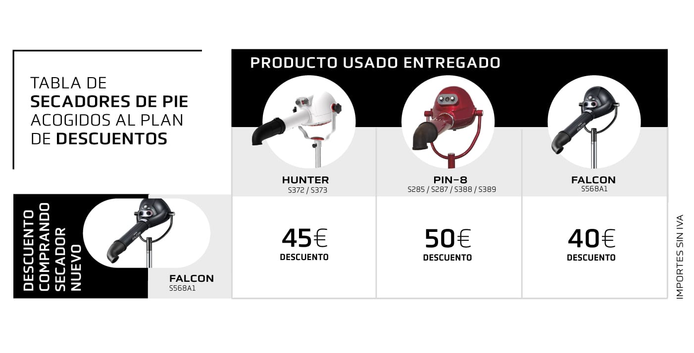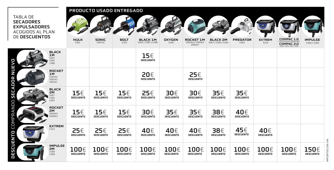 CASO PRÁCTICO: Entregando tu secador BLACK 2M, te damos un descuento de 35€ si compras un Black 2M, 38€ si compras un Extrem o un Rocket 2M y 100€ comprando un Impulse 2M.