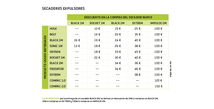 CASO PRÁCTICO: por la entrega de un secador BLACK 2M, te damos un descuento de 34€ si compras un Black 2m, 34€ si compras un Extrem y 100€ si compras un Impulse 2M.