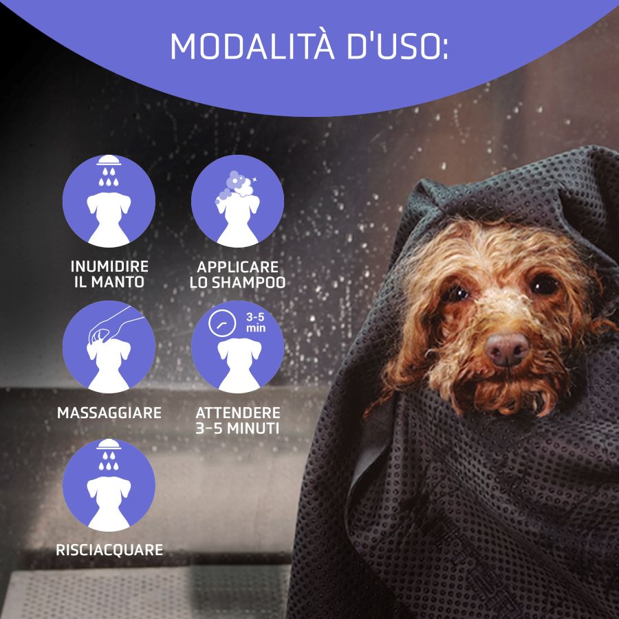Fai due applicazioni con questo shampoo per cani bianchi, con i rispettivi risciacqui, e ricorda di lasciare agire la seconda applicazione per 3-5 minuti prima di risciacquare. Più a lungo lo shampoo rimane sull'animale, maggiore sarà l'effetto.