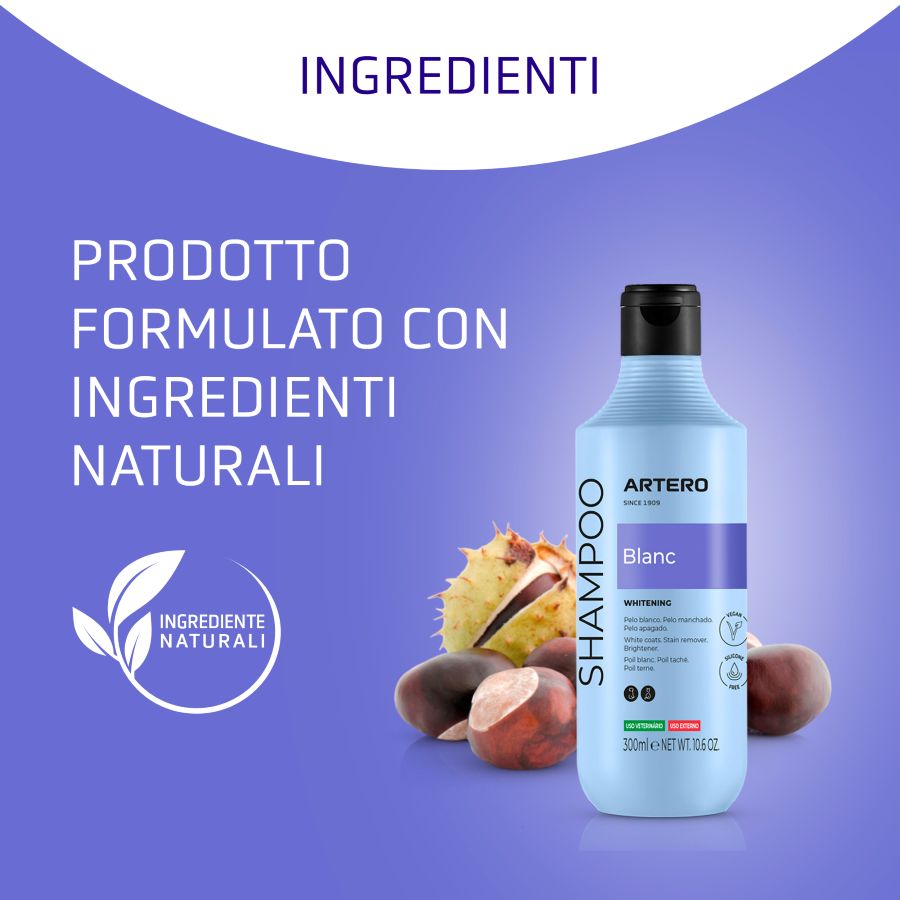 <p>Offri al tuo compagno a quattro zampe una cura completa con il nostro <strong><a style="color: #00bfb3;" href="https://artero.com/it/petcare/cosmetici-cani/shampoo-cani">shampoo per cani</a></strong>, sviluppato per mantenere il pelo pulito e sano.</p></div><div data-content-type="divider" data-appearance="default" data-element="main"><hr data-element="line" data-pb-style="GHR0NGF"></div><div data-content-type="text" data-appearance="default" data-element="main"><h2 id="F2HFEWC" style="text-align: center;"><strong>Caratteristiche</strong></h2></div><div data-content-type="text" data-appearance="default" data-element="main"><ul> <li style="text-align: justify;">Intensifica i colori nero, grigio e bianco</li> <li style="text-align: justify;">Conferisce una lucentezza extra</li> <li style="text-align: justify;">Il pelo rimane pulito, morbido e brillante dalla radice alle punte.</li> <li style="text-align: justify;">Adatto per cani e gatti di tutte le razze</li> <li style="text-align: justify;">Ideale per pelle sensibile o lavaggi frequenti</li> <li id="E3RK3UL" style="text-align: justify;">Fornisce protezione sia al pelo che alla pelle</li> </ul></div></div><div class="pagebuilder-column" data-content-type="column" data-appearance="full-height" data-background-images="{}" data-element="main" data-pb-style="HTBAC4R"></div><div class="pagebuilder-column" data-content-type="column" data-appearance="full-height" data-background-images="{}" data-element="main" data-pb-style="JLEIH7N"><figure data-content-type="image" data-appearance="full-width" data-element="main" data-pb-style="VAQQ3X3"><img class="pagebuilder-mobile-hidden" src="{{media url=wysiwyg/02_Funciones_H648__BLANC_IT.jpg}}" alt="" title="" data-element="desktop_image" data-pb-style="SDXM2VX"><img class="pagebuilder-mobile-only" src="{{media url=wysiwyg/02_Funciones_H648__BLANC_IT.jpg}}" alt="" title="" data-element="mobile_image" data-pb-style="BOJPUOM"></figure></div><div class="pagebuilder-column" data-content-type="column" data-appearance="full-height" data-background-images="{}" data-element="main" data-pb-style="TFSHY8C"></div></div></div><div data-content-type="divider" data-appearance="default" data-element="main"><hr data-element="line" data-pb-style="M2QYAX9"></div></div></div><div data-content-type="row" data-appearance="contained" data-element="main"><div data-enable-parallax="0" data-parallax-speed="0.5" data-background-images="{}" data-background-type="image" data-video-loop="true" data-video-play-only-visible="true" data-video-lazy-load="true" data-video-fallback-src="" data-element="inner" data-pb-style="CSE8BT9"><div class="pagebuilder-column-group" data-background-images="{}" data-content-type="column-group" data-appearance="default" data-grid-size="12" data-element="main" data-pb-style="A53LYX7"><div class="pagebuilder-column-line" data-content-type="column-line" data-element="main" data-pb-style="HW7G094"><div class="pagebuilder-column" data-content-type="column" data-appearance="full-height" data-background-images="{}" data-element="main" data-pb-style="RESAVRN"></div><div class="pagebuilder-column" data-content-type="column" data-appearance="full-height" data-background-images="{}" data-element="main" data-pb-style="U1AU5NE"><div data-content-type="text" data-appearance="default" data-element="main" data-pb-style="CCMBTUF"><h2 id="F2HFEWC" style="text-align: center;"><strong>Modo d'uso</strong></h2></div><div data-content-type="text" data-appearance="default" data-element="main"><p>Quando si applica il prodotto, si consiglia di seguire questi passaggi:</p> <p>→ Districare il pelo prima del bagno per facilitare la penetrazione dell'acqua e dello shampoo.</p> <p>→ Bagnare bene l'area da lavare</p> <p>→ Applicare lo shampoo e massaggiare fino a formare schiuma</p> <p>→ Risciacquare</p> <p>→ Ripetere il lavaggio, lasciando agire il prodotto per tre minuti.</p> <p>→ Risciacquare abbondantemente</p></div><div data-content-type="divider" data-appearance="default" data-element="main"><hr data-element="line" data-pb-style="G7NOC2D"></div><div data-content-type="text" data-appearance="default" data-element="main" data-pb-style="BWXQ7KL"><h2 id="F2HFEWC" style="text-align: center;"><strong>Vuoi ottenere risultati migliori? </strong></h2></div><div data-content-type="text" data-appearance="default" data-element="main"><p style="text-align: justify;">Fai due applicazioni con questo <strong>shampoo per cani bianchi</strong>, con i rispettivi risciacqui, e ricorda di lasciare agire la seconda applicazione per 3-5 minuti prima di risciacquare. Più a lungo lo shampoo rimane sull'animale, maggiore sarà l'effetto.</p>