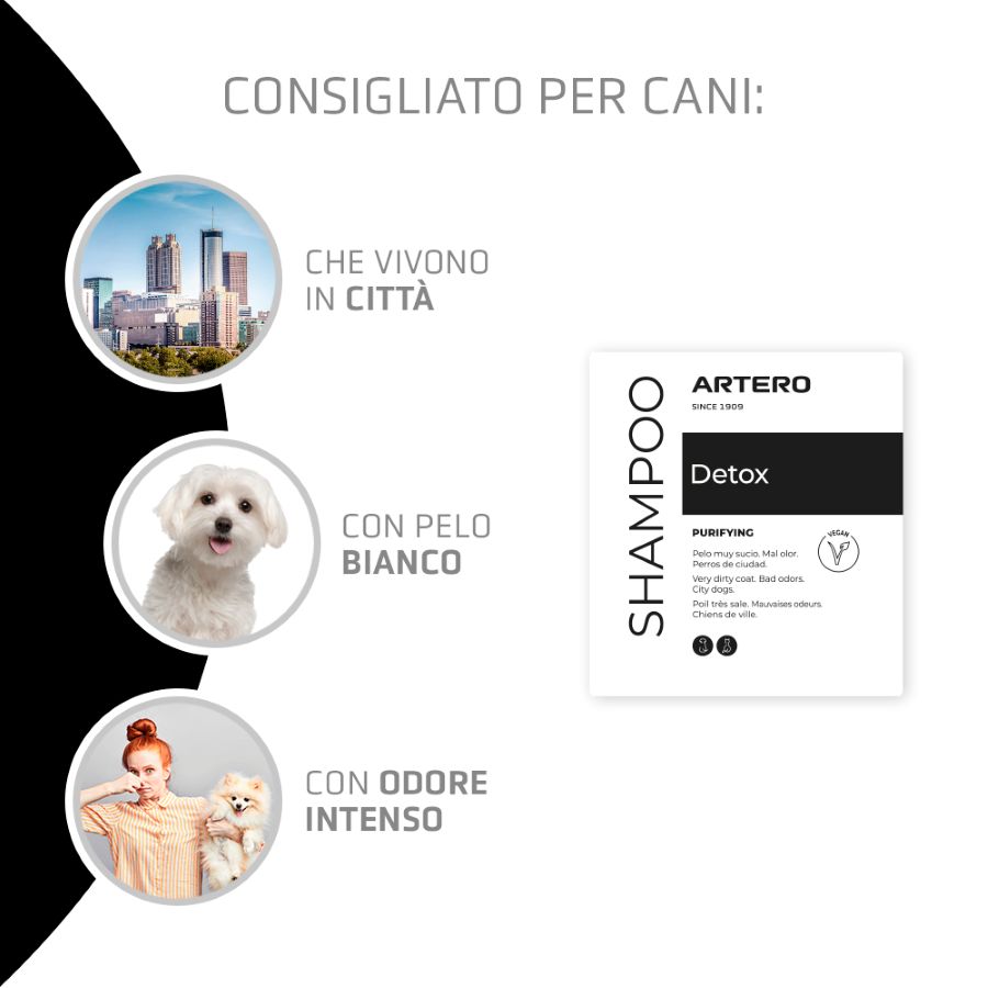 Raccomandazioni dei nostri esperti Lo Shampoo Artero Detox è destinato principalmente ai cani delle grandi città. Il loro pelo tende a perdere lucentezza e diventare opaco a causa dei fattori ambientali delle aree urbane.
