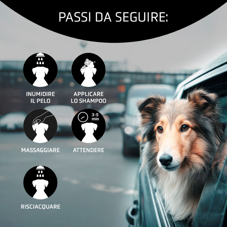 Vuoi ottenere risultati migliori? Effettua due applicazioni di shampoo, con i rispettivi risciacqui, e ricorda di lasciare agire la seconda applicazione per 3-5 minuti prima di risciacquare. Più tempo lo shampoo rimane sull'animale, maggiore sarà l'effetto.