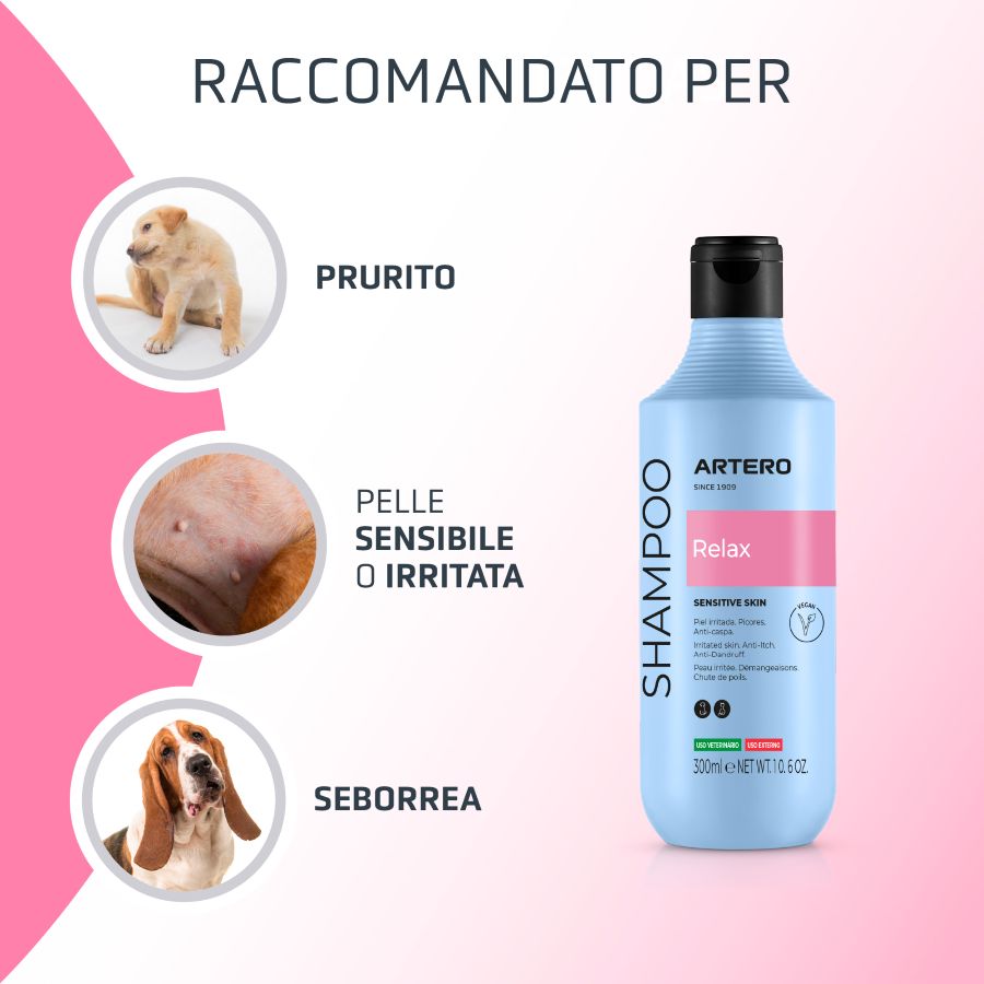 Raccomandazioni dei nostri esperti Lo Shampoo Artero Relax è raccomandato per cani che soffrono di prurito, hanno pelle irritata o sensibile e tendono ad avere seborrea.