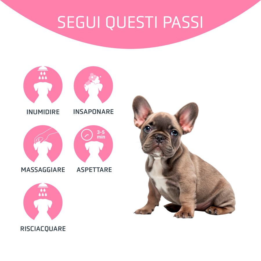 Vuoi ottenere risultati migliori? Fai due applicazioni di shampoo, con i rispettivi risciacqui, e ricorda di lasciare agire la seconda applicazione per 3-5 minuti prima di risciacquare. Più tempo lo shampoo rimane sull'animale, maggiore sarà l'effetto.