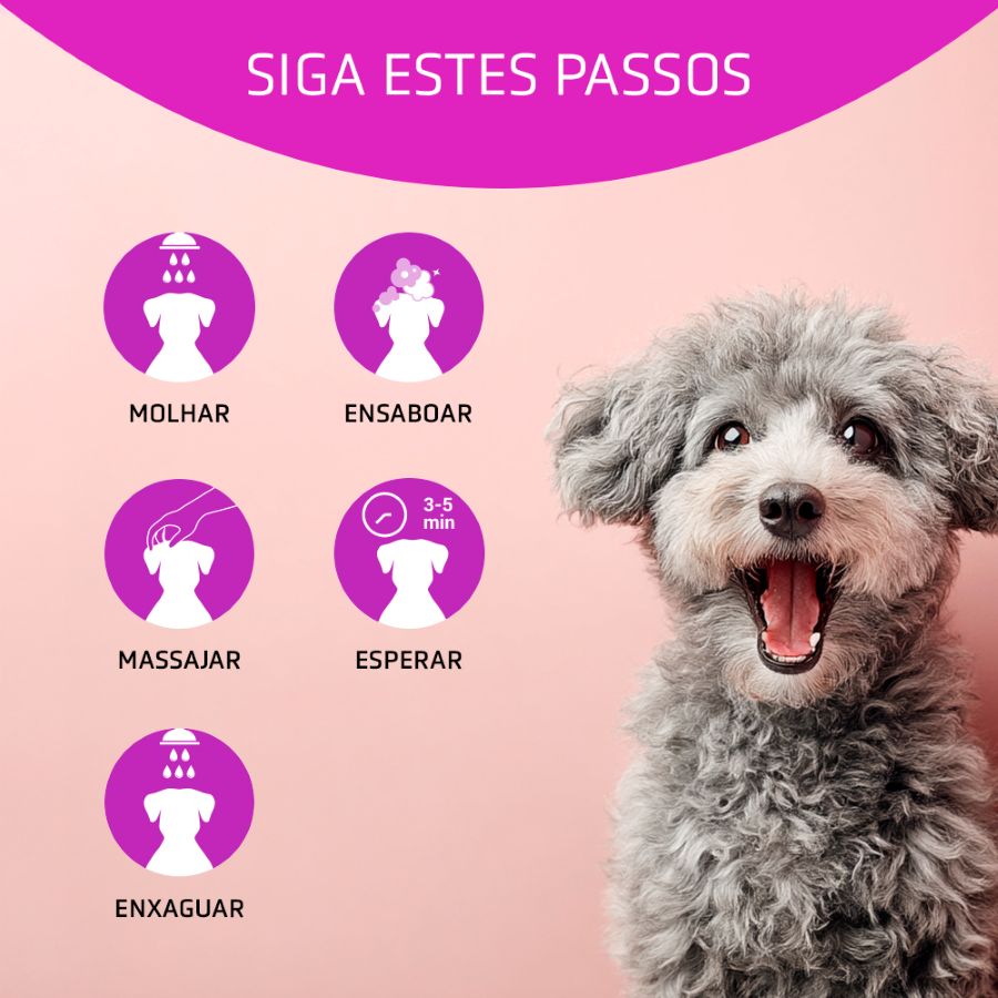 Faça duas aplicações de champô, com os respetivos enxaguamentos, e lembre-se de deixar a segunda aplicação atuar por 3-5 minutos antes de passar por água. Quanto mais tempo o champô permanecer no animal, maior será o efeito.