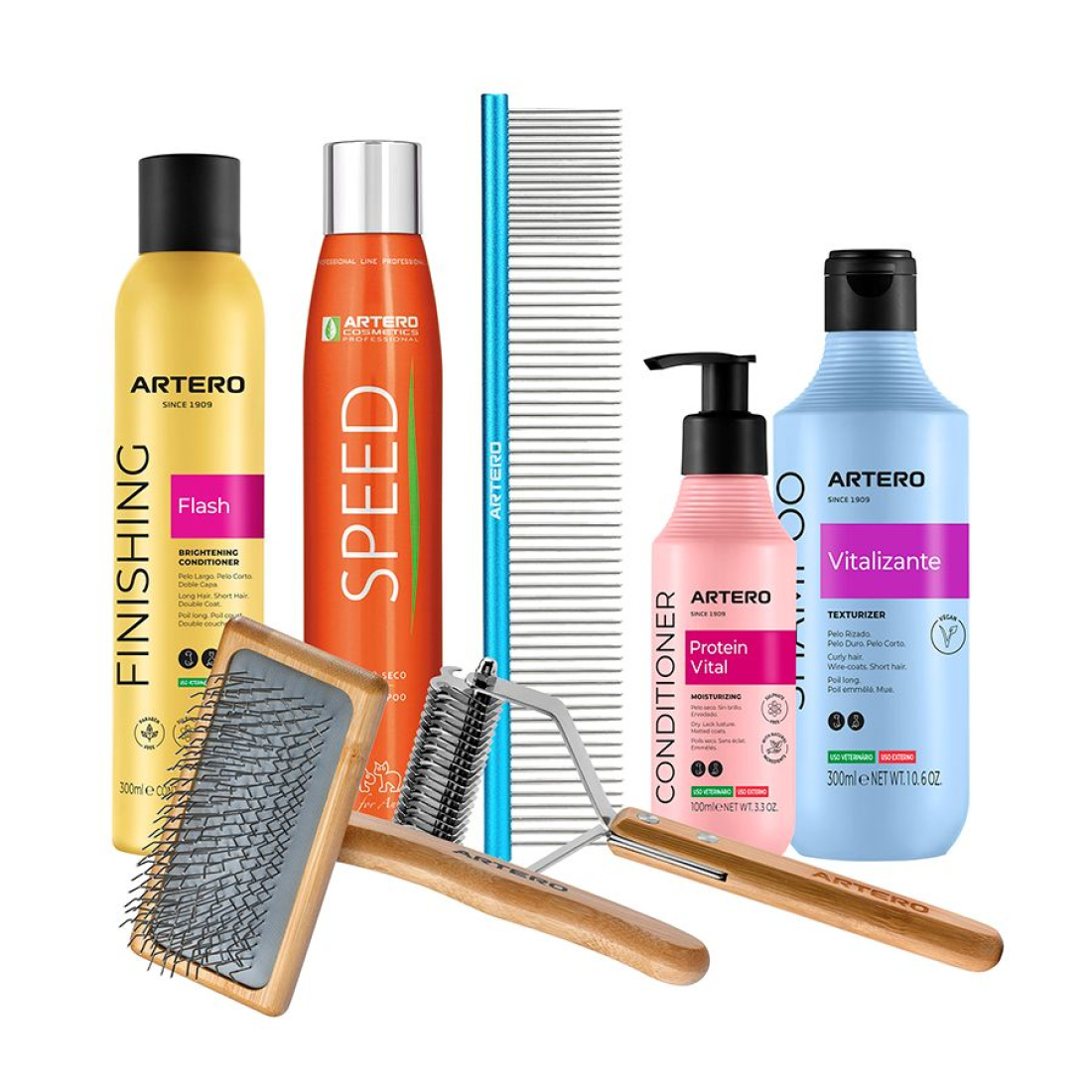 Um pack que combina uma gama de cosméticos para a higiene e condicionamento, facilitando a escovagem. Juntamente com a cardadeira e o desembaraçador, elimina o pelo morto com facilidade antes que este se espalhe pela casa