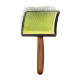 Segure a escova pela pega ergonómica e utilize-a com movimentos suaves e controlados, deslizando as pontas ao longo do pêlo para eliminar nós e emaranhados. Ideal para trabalhar em mantos emaranhados, em muda ou em pêlos com nós, proporcionando um desembaraçamento eficaz e delicado sem danificar a pele.