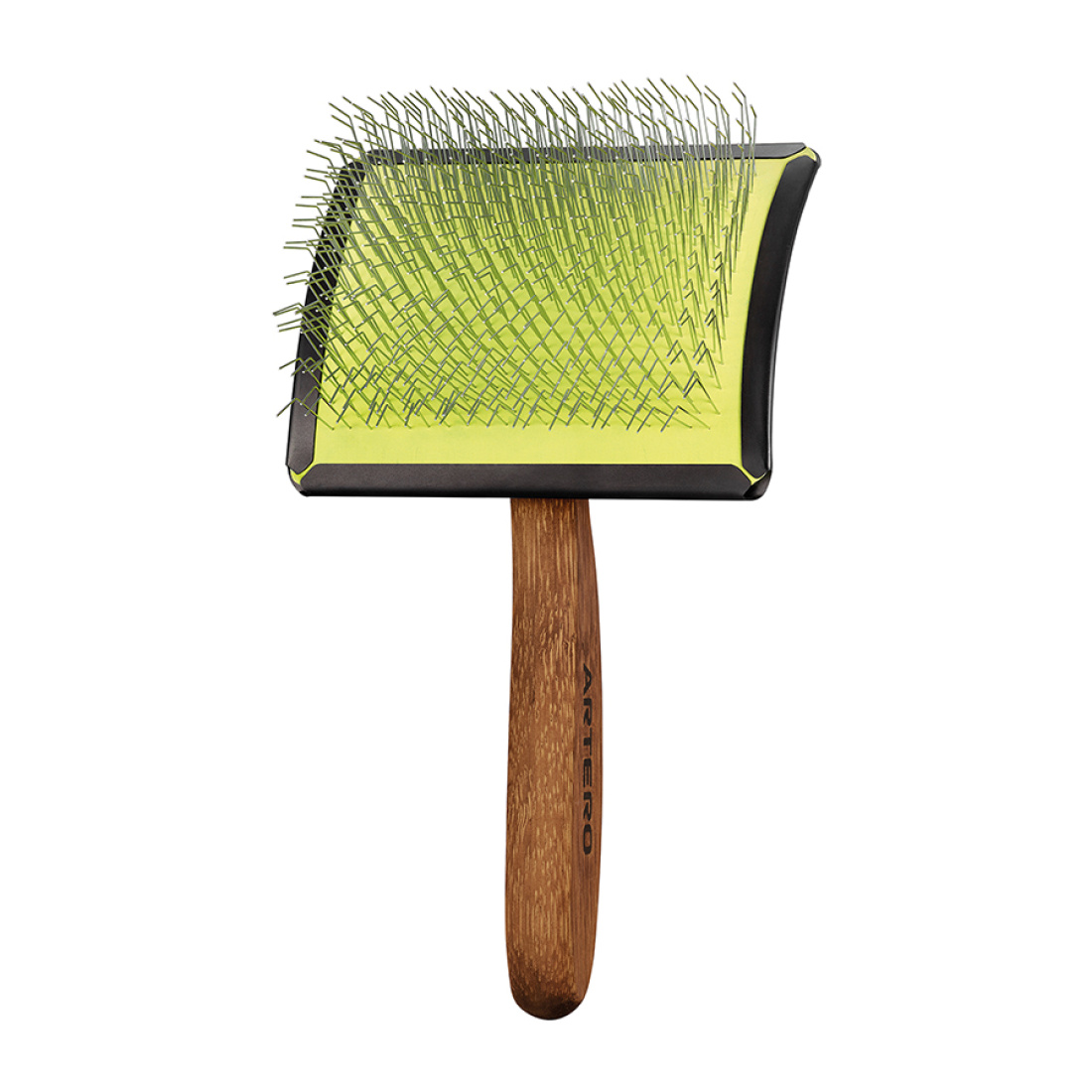A sua cabeça curva em aço inoxidável com acabamento preto mate não só proporciona resistência a quedas, como também garante uma maior durabilidade e fiabilidade. As pentes de 17 mm, grossas e firmes, permitem desembaraçar sem esforço, enquanto a almofada de borracha amarela ajuda as pentes a adaptarem-se melhor ao pêlo, proporcionando um tratamento mais suave e delicado à pele. Além disso, o design curvo da cabeça permite que todas as pontas tenham melhor incidência durante a escovagem, acelerando o processo de desembaraçar e melhorando a eficiência do trabalho.